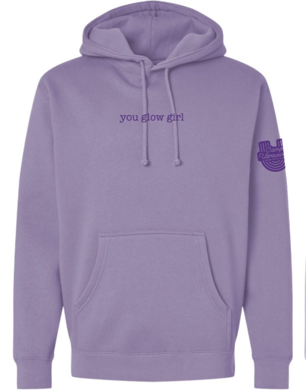 This soft lavender hoodie features the camp’s signature encouraging mantra right across the chest: You Glow Girl.